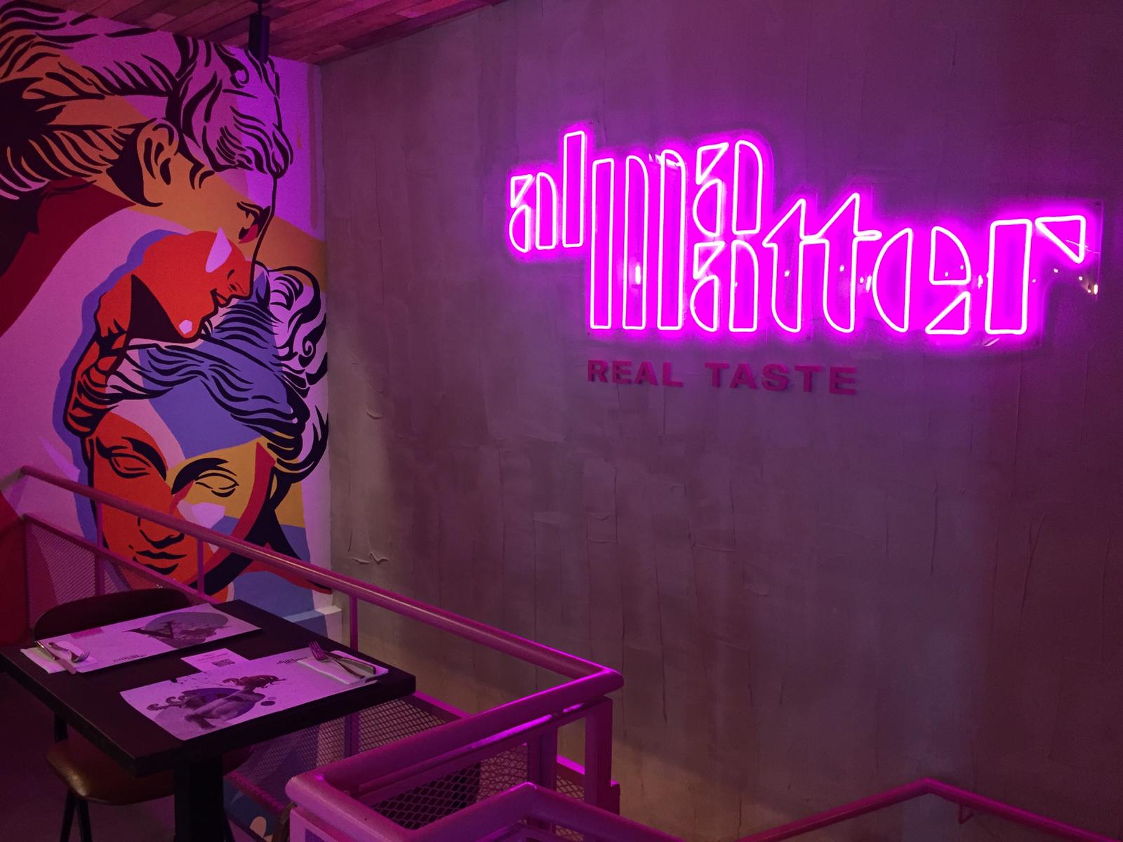 El espacio sumerge a los comensales en un ambiente cálido lleno de street art, entre otras artes. Un proyecto del reputado estudio de diseño de interiores Dorotea Estudio que brilla por su creatividad y tinte urbano, sumiendo a todo aquel que se adentre entre sus paredes en un ambiente de llamativo arte callejero.