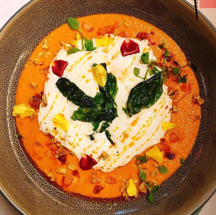 Nosotros empezamos con la Crema templada de Tomate: Espuma de queso de cabra, nueces caramelizadas, tomate concassé, crujiente de albahaca y flores comestibles. ¡Una sorpresa y un sabor intenso a tomate que nos flipó!