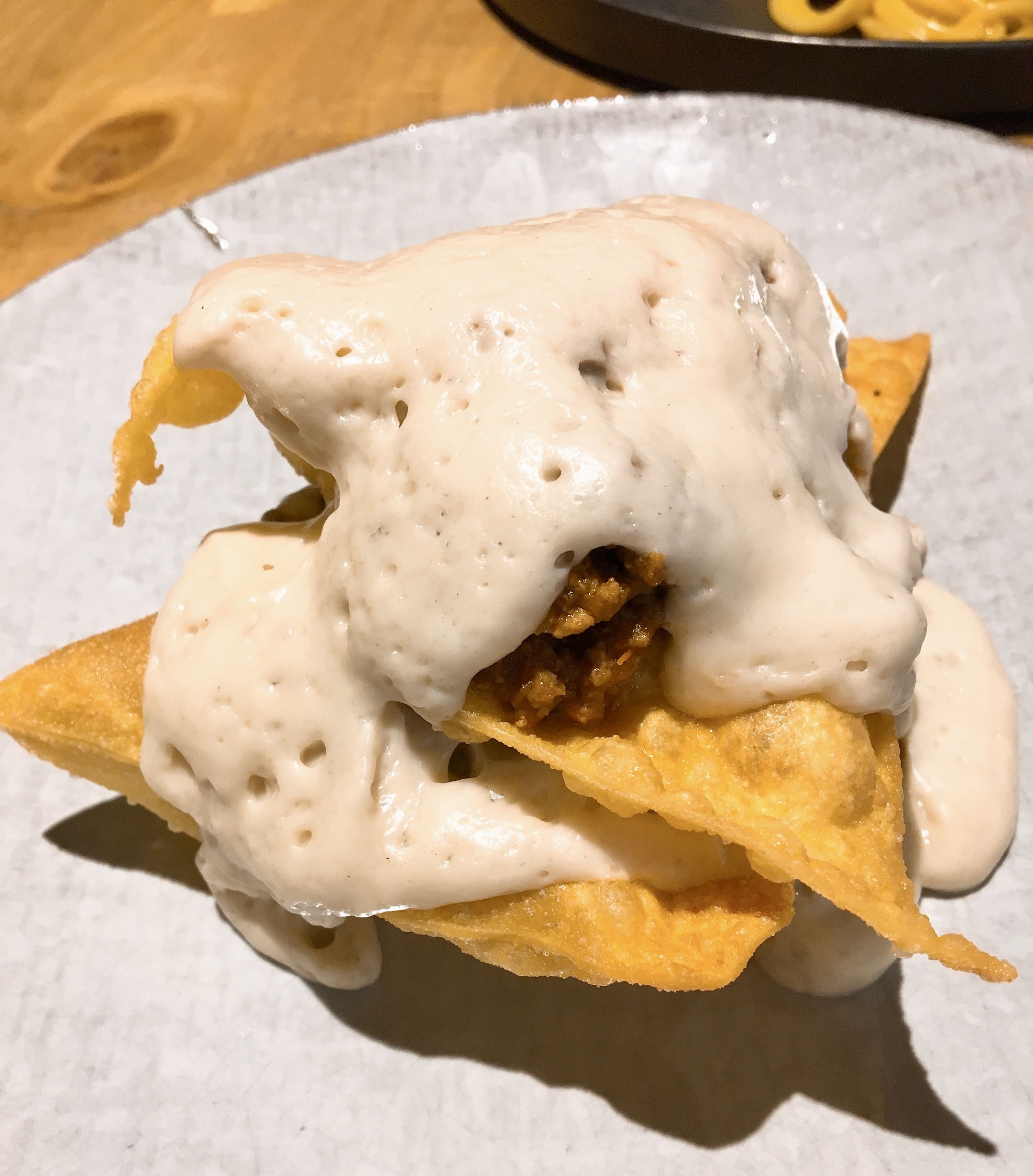 La carta es tan apetitosa que nos costó decidirnos, ¡queríamos probarlo todo!, pero teníamos clara una cosa: teníamos que probar su burrata, nos habían hablado genial de ella. Optamos por empezar con la ensalada Caprese, muy recomendada por el chef, y fue todo un acierto porque encontramos una deliciosa combinación de hojas verdes, con tomate asado, burrata ahumada y almendras tostadas de Capri. A continuación llegaron los dos platos principales, teníamos que probar su pasta carbonara (somos muy fans de la carbonara) y su especial lasaña. Elegimos los spaghetti carbonara con guanciale, yema de huevo y pecorino de Lacio, y son brutales… no dejéis de pedirlos, es buenísima la mezcla que hacen con el huevo. Seguimos con su lasaña crujiente con ragú a la boloñesa y espuma de parmigiano de Emilia- Romanna, una lasaña muy diferente, sorprende por ser muy ligera y muy sabrosa. Su rueda de queso también es muy destacable, se nos hacía la boca agua viendo su elaboración y, sobre todo, su aroma… Por último, no podíamos terminar nuestra experiencia gastronómica de otro modo que no fuese probando su tiramisú, tan cremoso y auténtico que sin duda te transporta al lugar desde el que nos traen la receta, Friuli-Venecia.