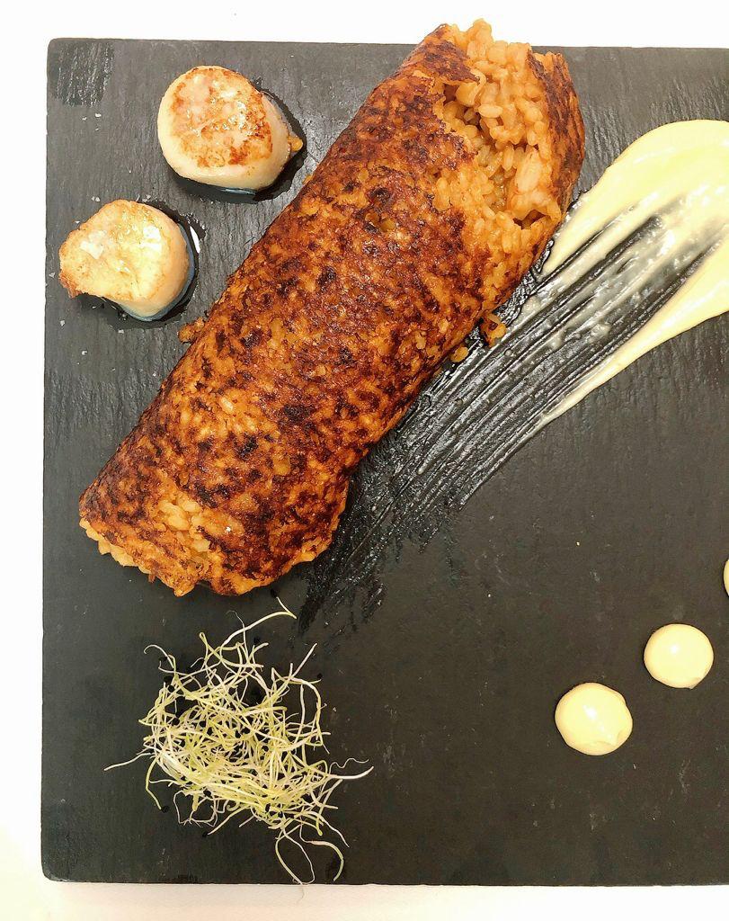 Continuamos con una exquisita propuesta que ¡no debes perderte!: socarrat con gamba de Huelva y vieira con ali-oli. Hacía tiempo que no probábamos uno tan exquisito.